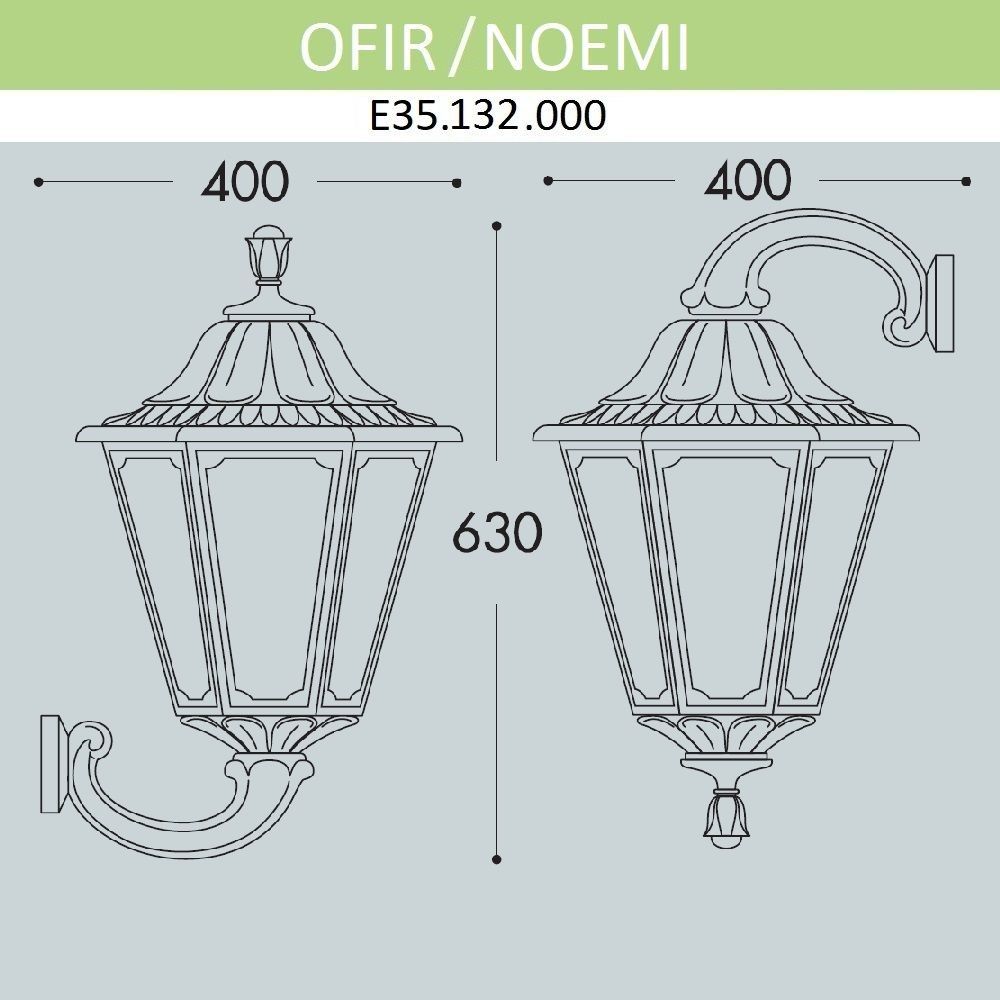 Светильник уличный настенный FUMAGALLI большого размера серии NOEMI, модель OFIR/NOEMI. Настенный уличный фонарь, большого размера с креплением на стену устанавливается на стены домов, котеджей, заборов и других вертикальных поверхностей. Используется для освещения входных групп, общего уличного освещения, декоративной и фасадной подсветки. Изготовлены в Италии, по уникальным технологиям FUMATECH из современного композитного полимера RESIN. Этот материал в 5 раз прочнее металла, не ржавеет, не окисляется, не выгорает на солнце, его не нужно красить. Все светильники пыле-влаго защищены по стандарту IP55 (Пылезащищенные, защита от водяных струй с любого направления). Рассеиватель выполнен из антивандального, не мутнеющего и не горючего PMMA (ПолиМетилМетаАкрилат). Срок службы светильника - не менее 20 лет. Температура использования от -60 до +90. В серии NOEMI есть садовые фонари в настенном (OFIR/NOEMI, MIRRA/NOEMI) подвесном (SICHEM/NOEMI) и наземном исполнении (IAFAET.R/NOEMI, ALOE.R/NOEMI, ARTU/NOEMI, GIGI/NOEMI, RICU/NOEMI, NEBO/OFIR/NOEMI 1L, NEBO/OFIR/ANNA 2L, TABOR/ADAM/NOEMI 3L) со столбами разной высоты, с разным количеством и конфигурацией голов. Консоли настенных фонарей и кронштейны светильников на столбах освещения могут устанавливаться в положение вверх и вниз. Столбы выше 150 см имеют в основе мощную стальную трубу с двойной оцинковкой. При заказе требуется выбрать цвет корпуса, цвет плафона и тип патрона (Е-27 или LED GX-53). Возможен светодиодный вариант. По стилю и дизайну серия уличных светильников NOEMI похожа на светильники среднего размера серии RUT и на светильники малого размера серии ANNA. По размеру относится к большим парковым светильникам как серия SIMON и GLOBE 400.