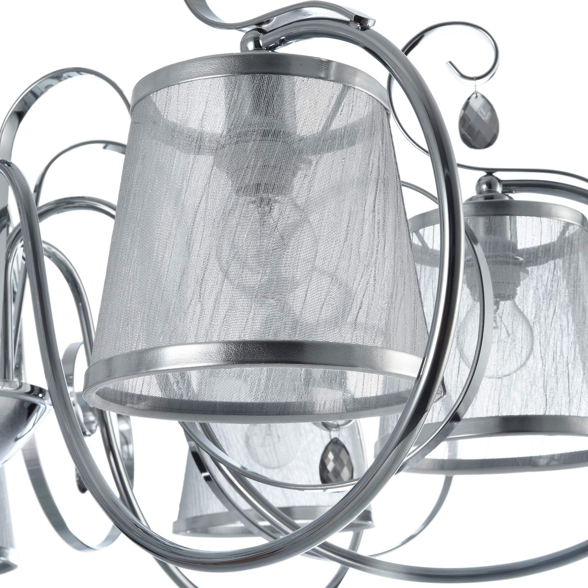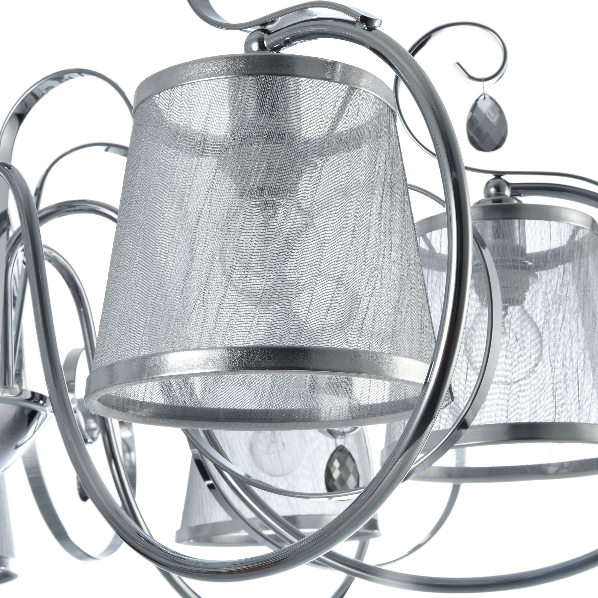 Абажуры и арматура светильников выполнены в разных цветах, с несколькими видами арматуры. Основание люстры украшено стеклянным декоративным элементом, а завитки рожков украшают подвески.